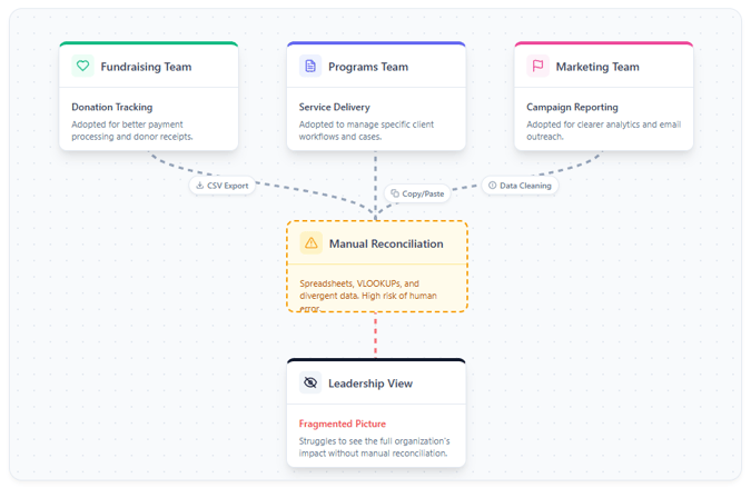 Most nonprofits adopt new technology with good intentions and to solve problems as they arise. Much like plugging a leak. The fundraising team needs better donation tracking. Marketing wants clearer campaign reporting. Programs need a system that works for their workflows. Each decision is reasonable in the moment and often necessary to keep work moving.